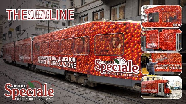 La campagna pubblicitaria ideata da GB22 trasforma i mezzi pubblici di diverse città italiane in autentiche spremute viaggianti. Le superfici esterne di tram e autobus sono state ricoperte da centinaia di arance che sembrano schiacciarsi contro il vetro, creando l’effetto visivo di spremere ironicamente i passeggeri all’interno.