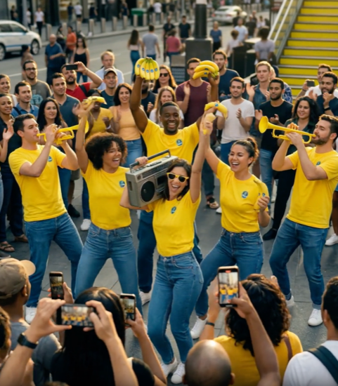 Nel video AI-generated, Times Square si anima in una sequenza travolgente: una folla in movimento segue l’icona del brand attraverso uno dei luoghi più riconoscibili al mondo, fondendo immaginario digitale e spirito collettivo in un unico racconto visivo.