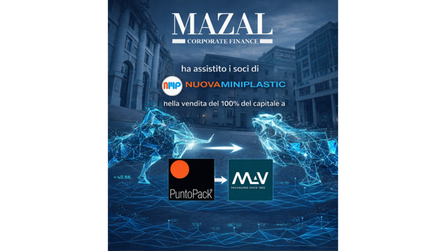 Mazal Corporate Finance ha supportato i soci di Nuova Mini Plastic S.r.l. nella cessione del 100% del capitale al Gruppo Punto Pack, operazione che rafforza la presenza del gruppo nel mercato italiano del packaging primario per i settori cosmetico, farmaceutico e alimentare. Il team di Mazal, composto da Massimo Giacomino e Sergio D’Alessandro, ha guidato i soci nella vendita della partecipazione a MAV S.r.l., società interamente detenuta da Punto Pack S.p.A. – Società Benefit.