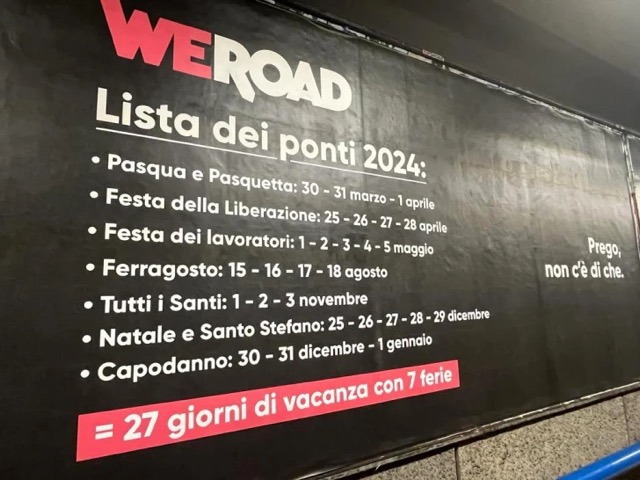 Nonostante il 2026 non si presenti particolarmente favorevole dal punto di vista del calendario festivo, WeRoad ha studiato una soluzione per gli amanti dei viaggi. La campagna, presente con oltre 400 affissioni sul circuito IGPDecaux della metropolitana milanese, dimostra come sia possibile ottenere ben 31 giorni di vacanza utilizzando strategicamente solo 8 giorni di ferie.